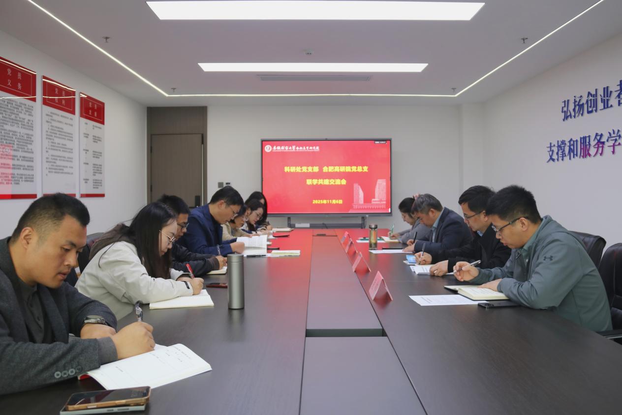 会议首先集中传达学习了《习近平谈治国理政》第五卷中习近平总书记关于建设科技强国的重要论述和重要讲话精神。校科研处党支部书记、处长梁中聚焦“两类基金”项目申报,简要介绍了学校有关政策和近期工作安排,重点从核心人员遴选、项目类型选择、辅导环节优化及资源拓展策略等维度展开深入辅导。他指出,合肥高等研究院青年人才高度集聚,是学校争取“两类基金”申报和立项突破的重要阵地,要深刻领会和贯彻学校专题部署要求,高度重视、持续发力抓好相关工作;要坚持练好内功与借好外力有机结合,以“1+6”内设科研平台体系为载体,全面做好院内组织发动、深化与各学院协调联动以及外请专家辅导等工作,浓厚氛围,完善机制,凝聚合力,激发活力,努力实现2026年“两类基金”申报及立项再创佳绩。他表示,科研处将一如既往关注跟进我院青年人才科研成长,以本次党建结对共建为契机,深化交流,密切联系,竭诚做好相关服务工作。科研处副处长肖仁桥结合“两类基金”申报,就科研诚信建设及学校科研经费管理相关政策作补充宣讲。